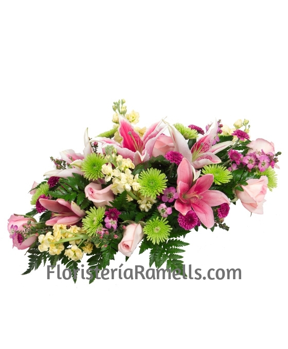 Con aire primaveral, es especialmente bonito es este Centro Flores Trípoli. Es un centro de flores de regalo compuesto por bonitas flores como el lilium, margaritas, lisiamthums, Ramells, rosas, matthiola, todo ello decorado también con bonitos verdes silvestres. En Floristería Ramells, su floristería online, podemos ayudarle a hacer el regalo perfecto. Haremos llegar a su ser querido, todo el amor y alegría que quiere demostrar con los centros de flores de regalo a domicilio. Sin duda, lo que quiere es hacer el mejor regalo. Además, ofrecemos a nuestros clientes un servicio de envío de flores, para que así lleguen tus flores para regalar a empresas o flores para nacimiento a tiempo.
