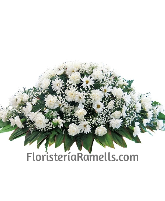 Nuestro Palma Funeraria Pureza, está compuesto por Clavel, Margaritas, Margarita Anastasia, Paniculata y Verdes Variados. Está diseñado en flor blanca El color se puede cambiar a gusto del cliente y efectuarlo en la tonalidad que mas guste. Es un centro de difunto que tiene un diseño moderno y original. Este centro de flores para dar condolencias está realizado con flores fúnebres de gran calidad. Somos floristas expertos, por lo que, haremos un trabajo excelente con los centros de flores para el tanatorio, para satisfacer las necesidades de nuestros clientes.