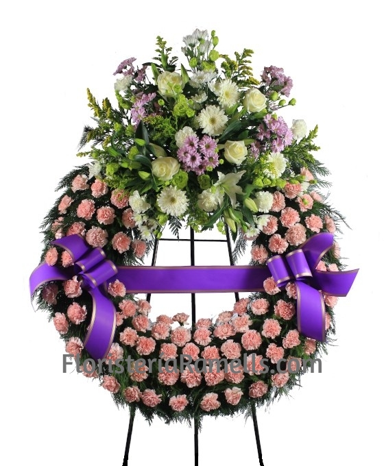 Delicada y exquisita, Corona Funeraria Basic. Delicada y exquisita. Con aro de claveles rosados. Y en la parte superior la adorna un hermoso cabecero de flor variada: salpicada de flores rosadas y blancas, como lilium, gerberas, margaritas, rosas y antirrhinum y bonitos verdes silvestres (Aro de 70-80 cm, con 1 cabezal, de 90 a 100 claveles, 8 margaritas, 4 liliums, 5 gerberas, 6 rosas tallo corto, 6 varas solidago, verdes variados y cinta funeraria). Si quiere comprar flores para funeral online nuestros trabajos funerarios están realizados siempre con flores para tanatorio frescas de primera calidad. En Floristería Ramells, tu Floristería de Mahón, somos floristas profesionales expertos en coronas de flores fúnebres. Dichas flores para tanatorio están suministradas por nuestros proveedores nacionales e internacionales. Por lo tanto, nuestros trabajos para funerales son siempre de una calidad excelente. Si quiere comprar flores para funeral, puede optar a nuestro servicio de envíos florales a tanatorios.