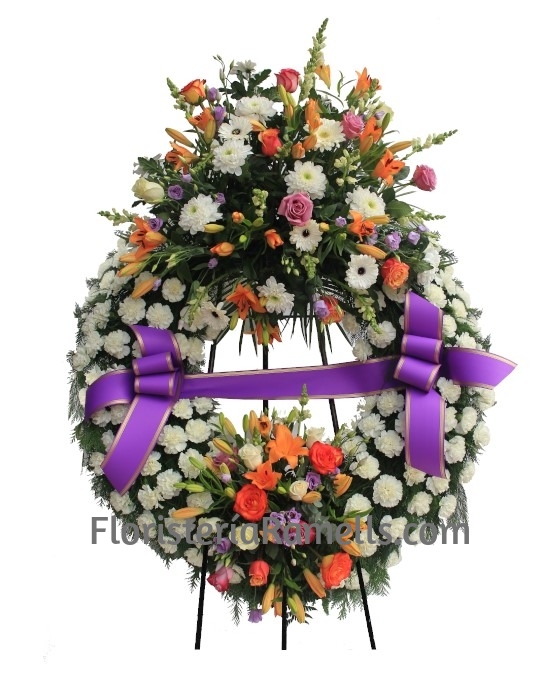 Bonita y fina Corona Funeraria Única de 2 cabezales para Funeral. Realizada en tonos variados. Compuesta por un aro de 70-80 cm con alrededor de 90 claveles de color blanco. Adornada por dos cabezales uno superior y otro inferior. El superior, está compuesto de flores en tonos rosas, naranjas y blancos y malvas. Sus flores son: 12 lilium, 10 rosas, gerberas, 8 antirrhinum, lisianthum, Ramells. Nuestras coronas de flores para sepelios están siempre realizadas con flores de primerísima calidad. Y está confeccionada por nosotros. Somos Floristas profesionales, expertos en el arte floral funerario. Las flores de nuestra corona de flores para difuntos, en Floristería Ramells de Mahón,  son siempre frescas y están suministradas por proveedores nacionales e internacionales. Así que nuestros trabajos funerarios son especiales y elegantes.
